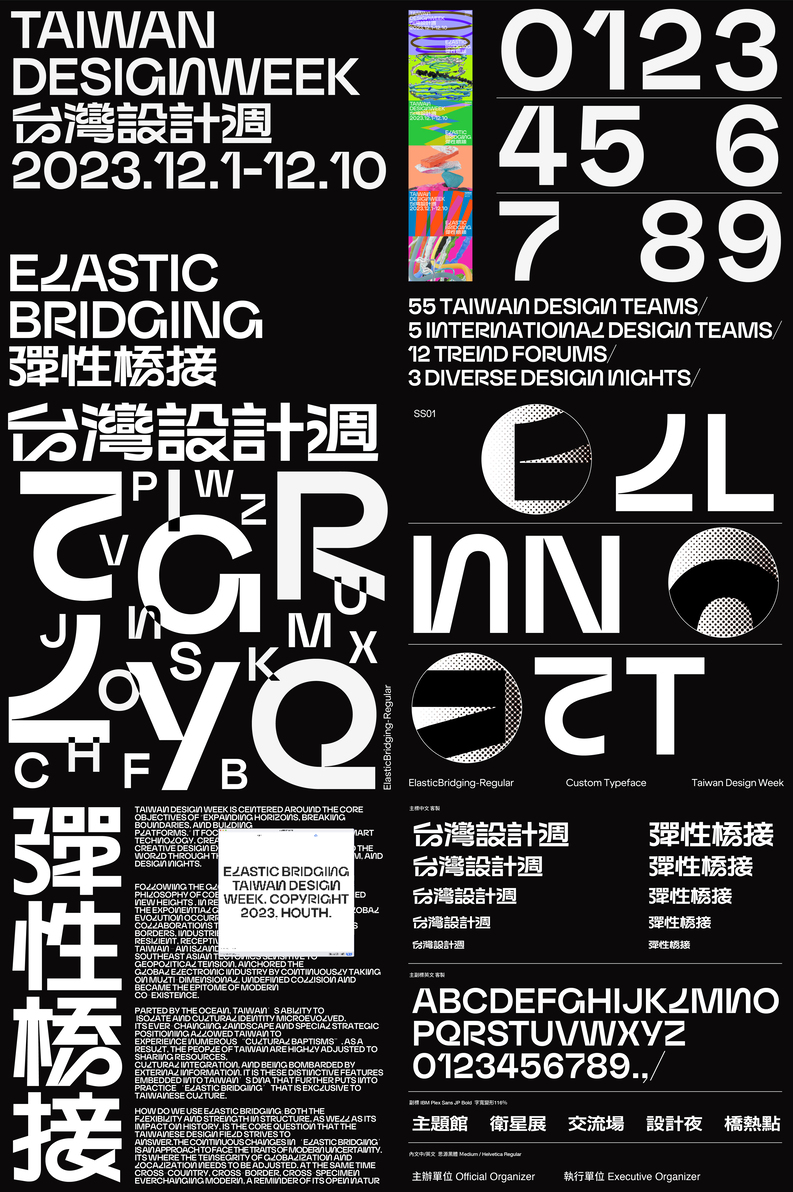 The visual identity for 2023 Taiwan Design Week is themed "Elastic Bridging." It features posters with shapes like springs, stacks, and linear interlacing, connecting 2D graphics with 3D drawings. Custom Chinese and English fonts showcase the flexible connection between straight and curved strokes. The color system reflects trendy local and international hybrids, conveying boldness, bravery, fearlessness, and exploration. This visual identity aims to present Taiwan Design's spirit to the world.
