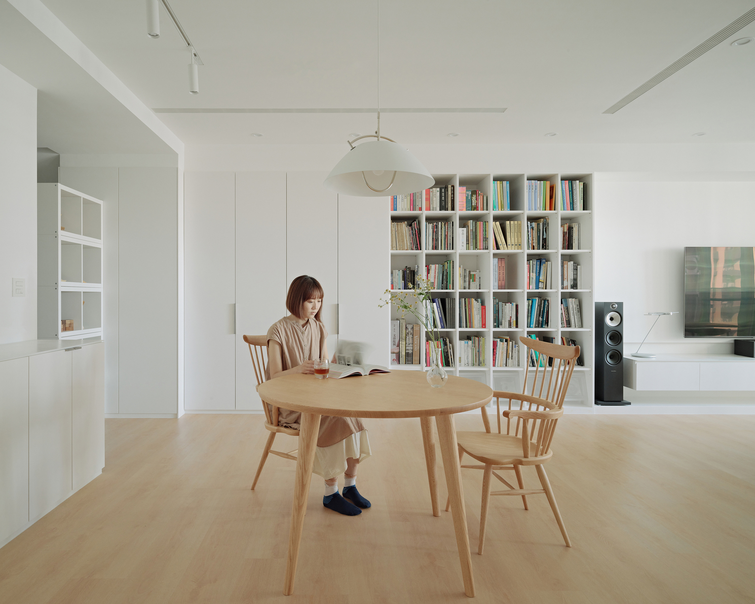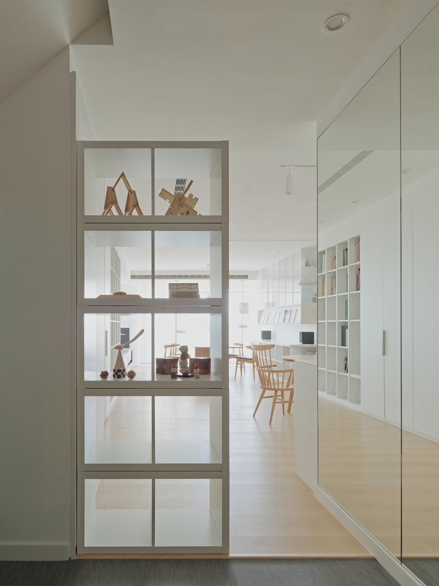 Combining white hues, a flexible layout, and unique cabinets, " Home`s Shape no.015" creates a living environment of both a library and a gallery. The public space replaces traditional sofas with a variety of chairs and tables, enhancing the flexibility of the space and making gatherings or daily activities with more diversity.