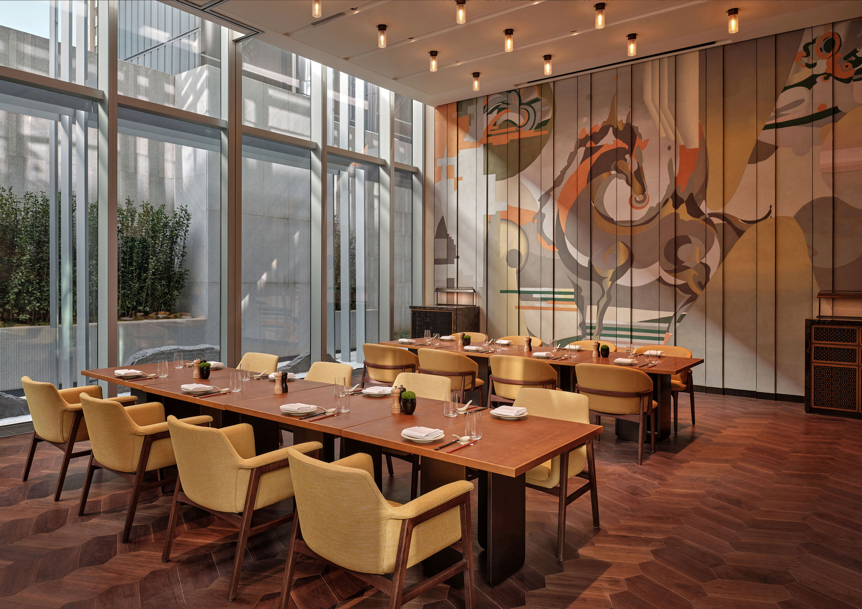 西安高新凱悅尚萃酒店的巨幅藝術壁畫設計以“絲語馬歌(The Whisper of Silk and The Song of Horses)”為理念,用富有當代性的設計語言展現出十三朝古都的歷史風韻與當代西安的活力精彩。