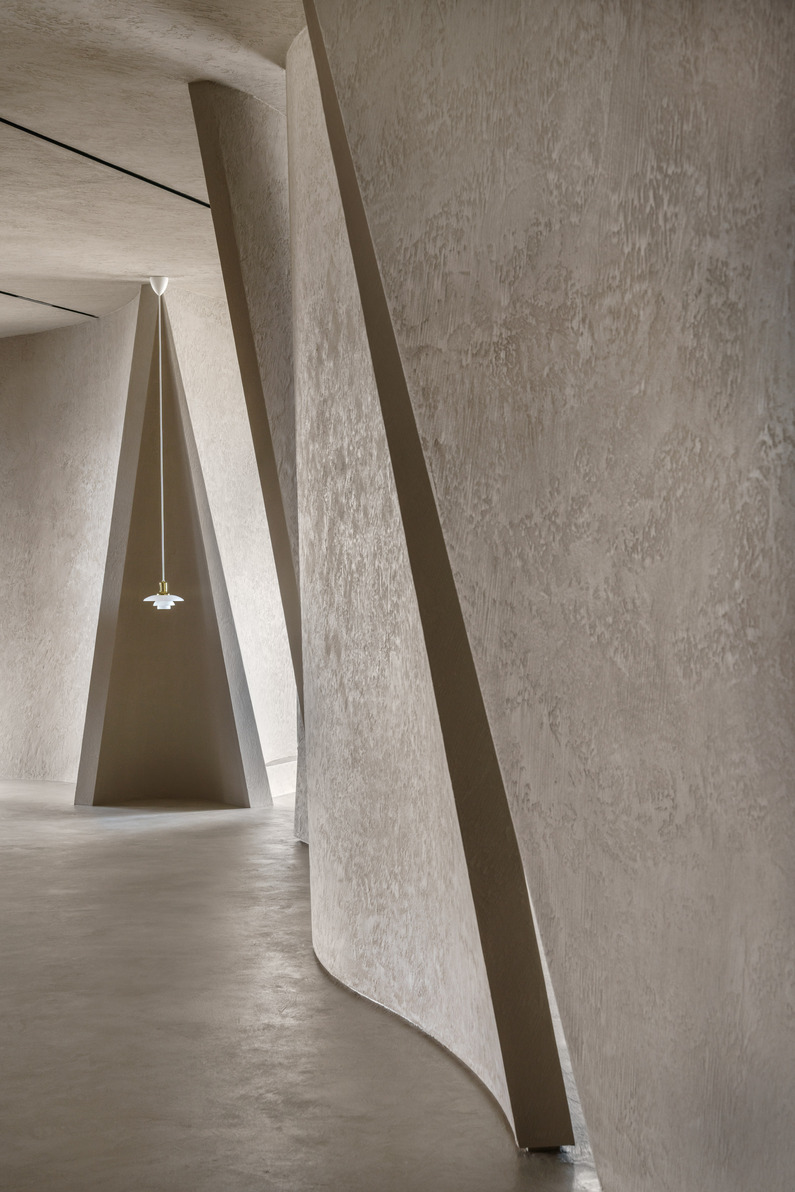 為探究一種非典型的居住型態,一對角線將空間分為二,一側為公領域的探討,另一側為私人居住的隱密,區域與區域彼此縫合,完成了空間。由礦石餘料與回收PP再製的礦粉塗料,突顯了每個隔間的曲線、輪廓,與流動姿態,使生活場域瀰漫藝術氣息與無受限的自由。