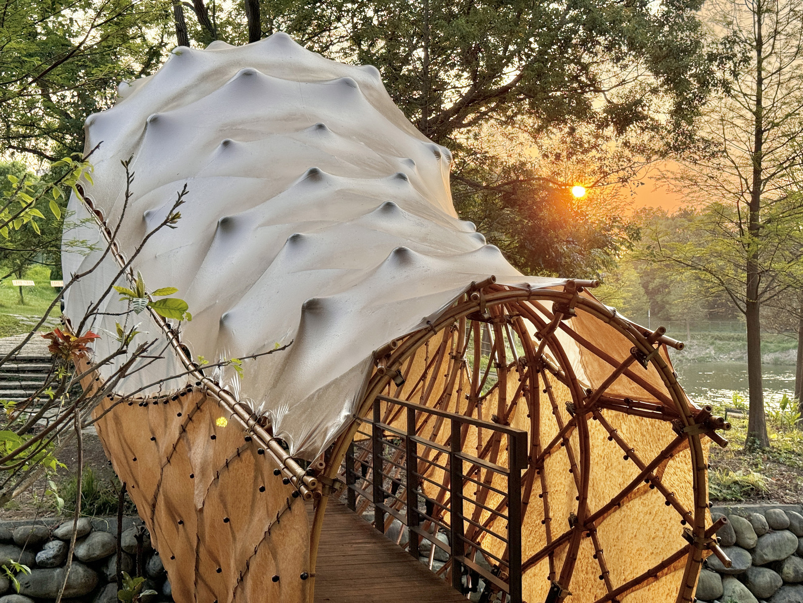 創作者師法自然,以全竹仿繭共構於小橋,提拱羽松湖畔一隅駐足歇息詩意空間。綠材革新工法「蒸氣彎竹」成竹拱結構,繃布、竹紙耐候處理如鼓皮防水透光肌理,回收漁業海廢浮球撐托氣流、層疊綁固。日照內影婆娑、夜燈如螢緩爍,橋行者進出宛如破繭而出的旅程。